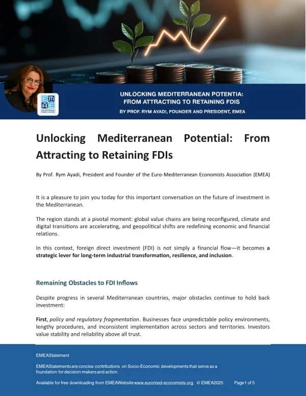 Statement on the 25 years of the Barcelona Process by Prof. Rym Ayadi, Founder and President of the Euro – Mediterranean Economists Association (EMEA) and Founder and Director of the Euro-Mediterranean Network for Economic Studies (EMNES). Link to Study